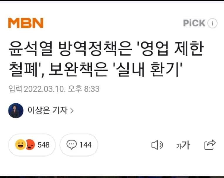 오늘 윤석열의 방역정책은 '영업 제한 철폐' , 보완책은 '실내 환기' 라는 기사가 떴다.