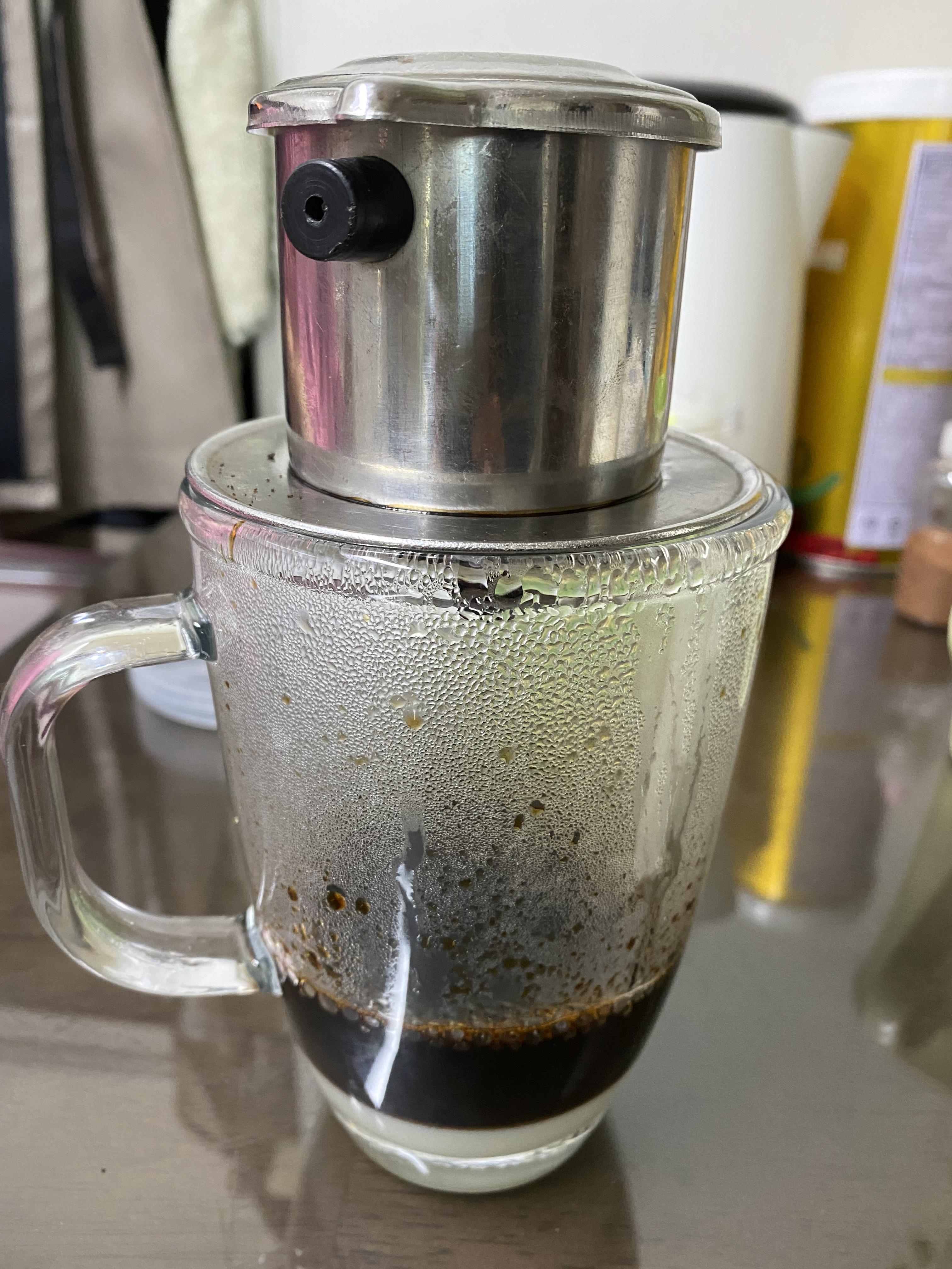 연유를 넣은 컵에 커피 추출기를 올리고 커피와 뜨거운 물을 넣어 커피를 추출한다.