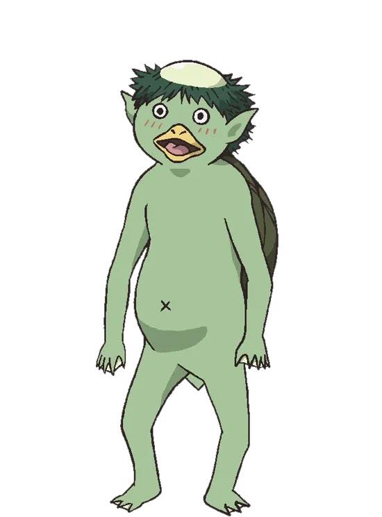 皆さんが知っている通り、 子どものような体格で、全身が緑色。背中に亀の甲羅のようなものを背負っていて、頭の上には丸い皿がある。