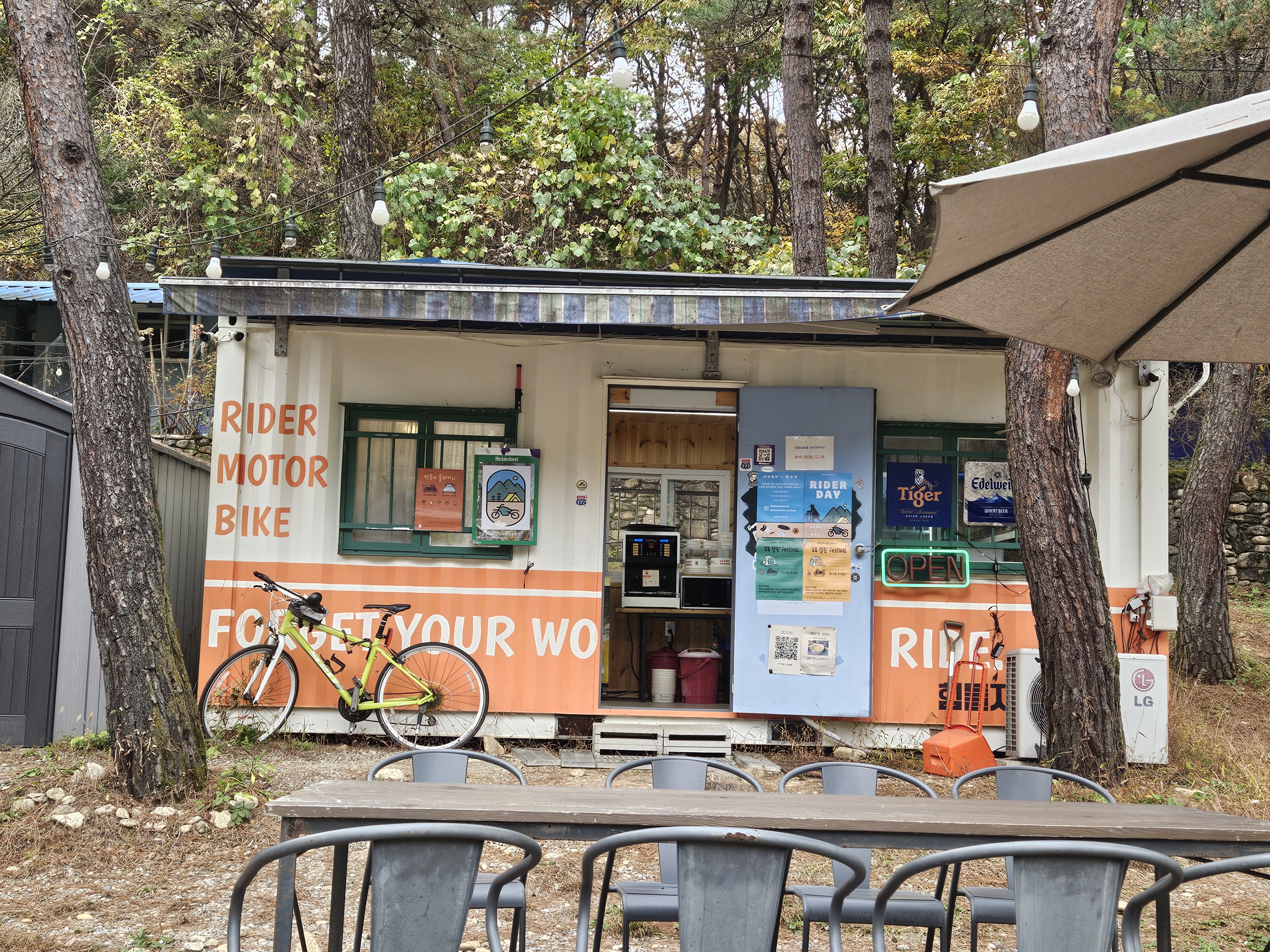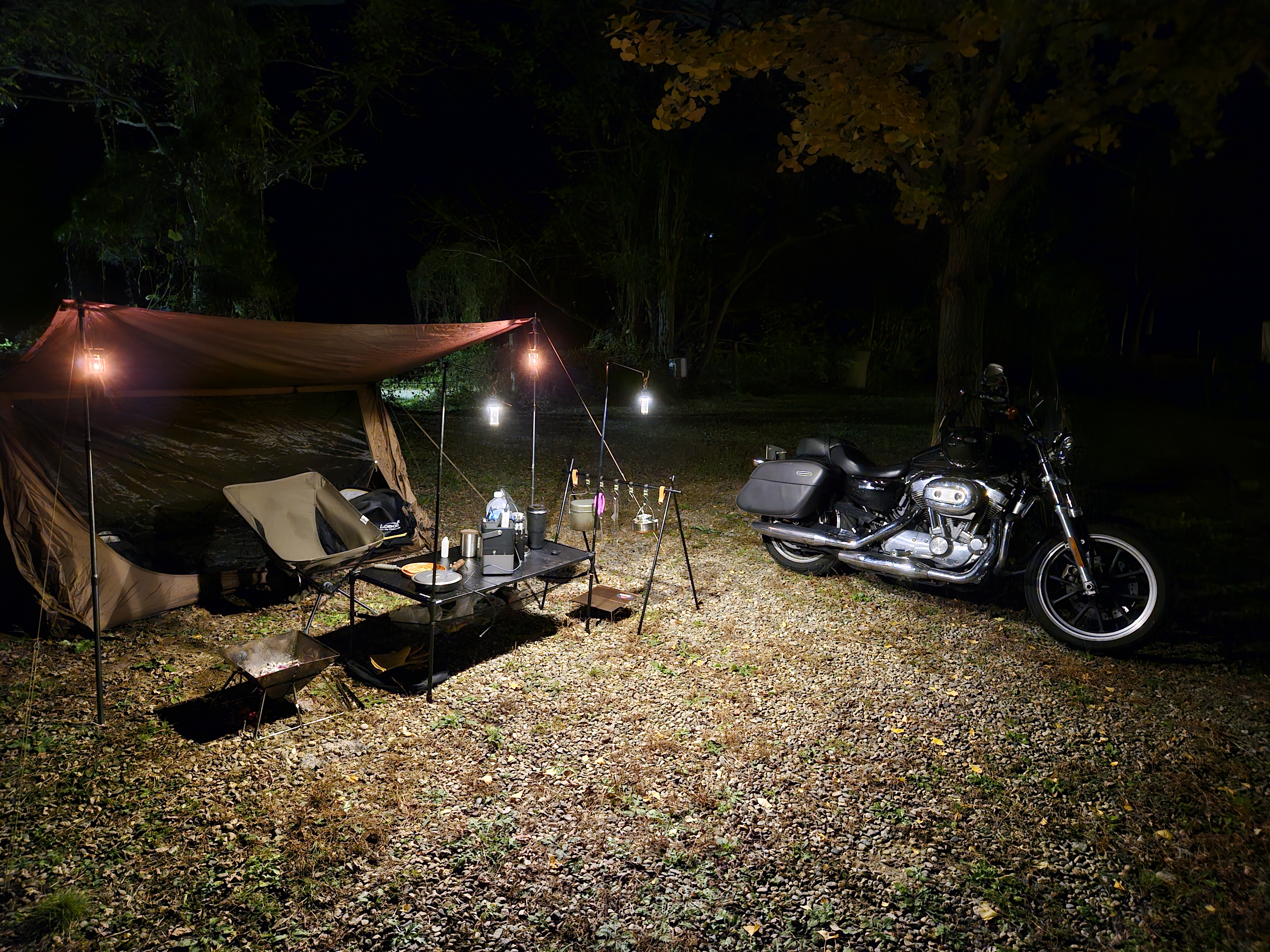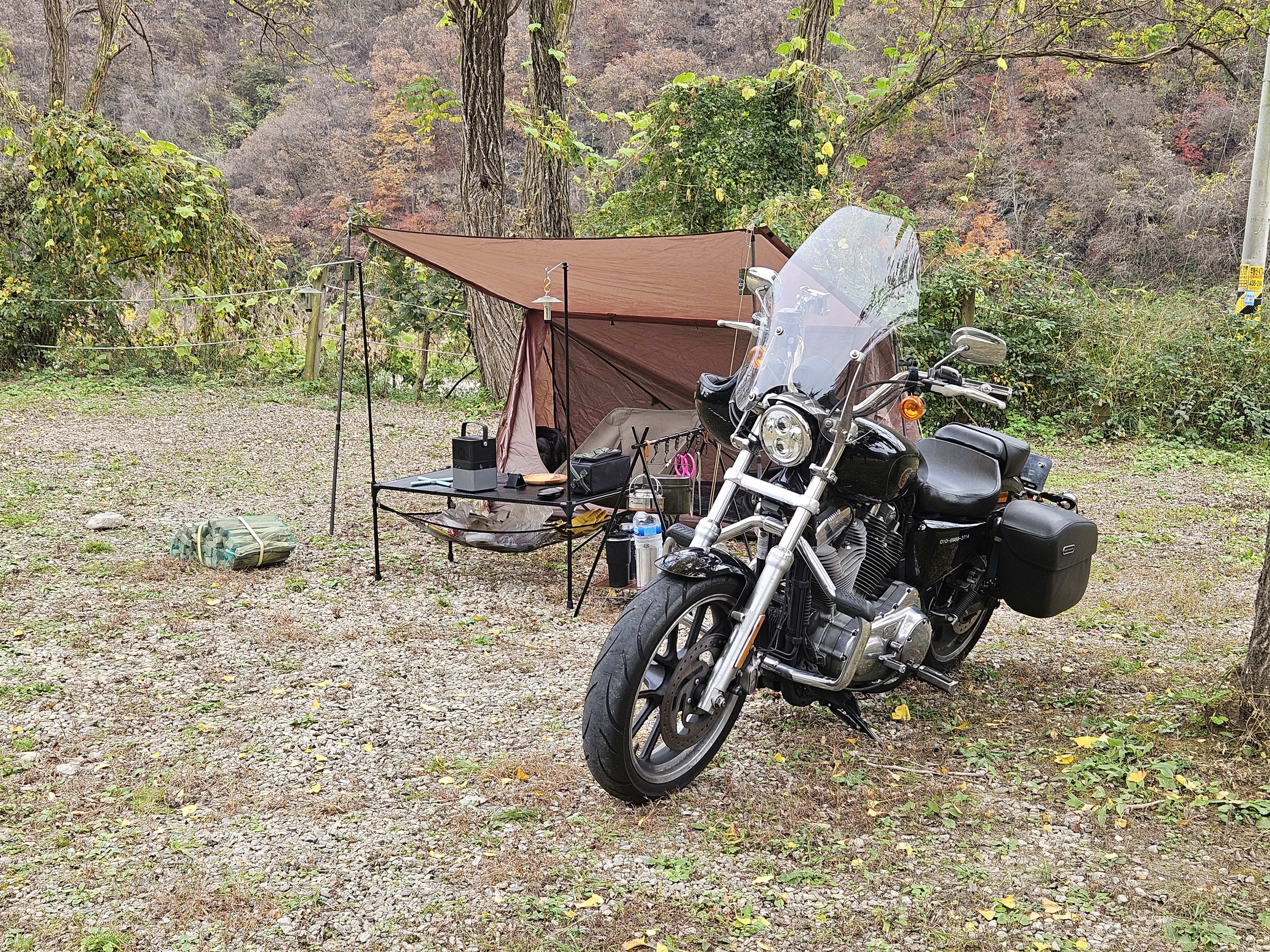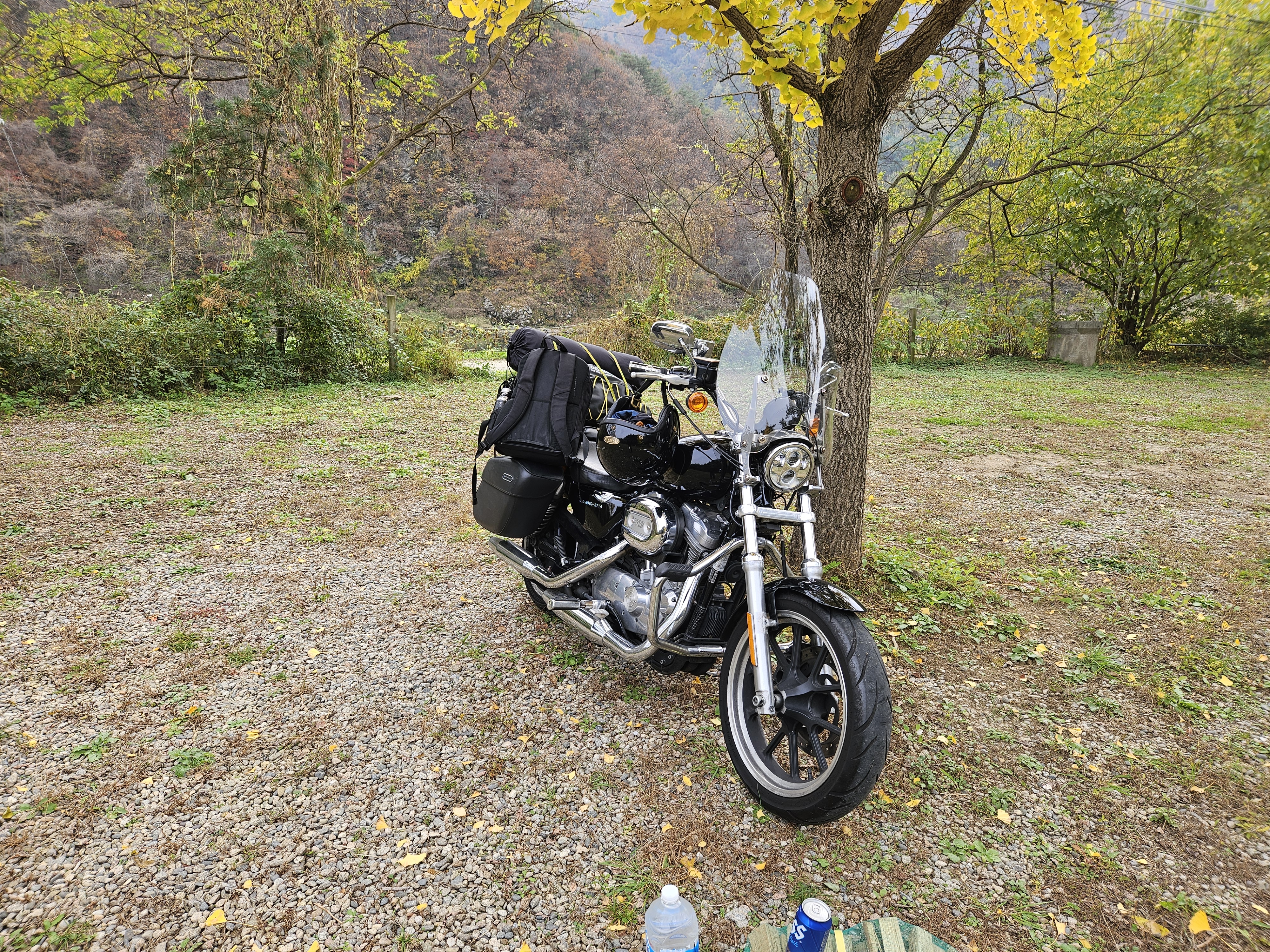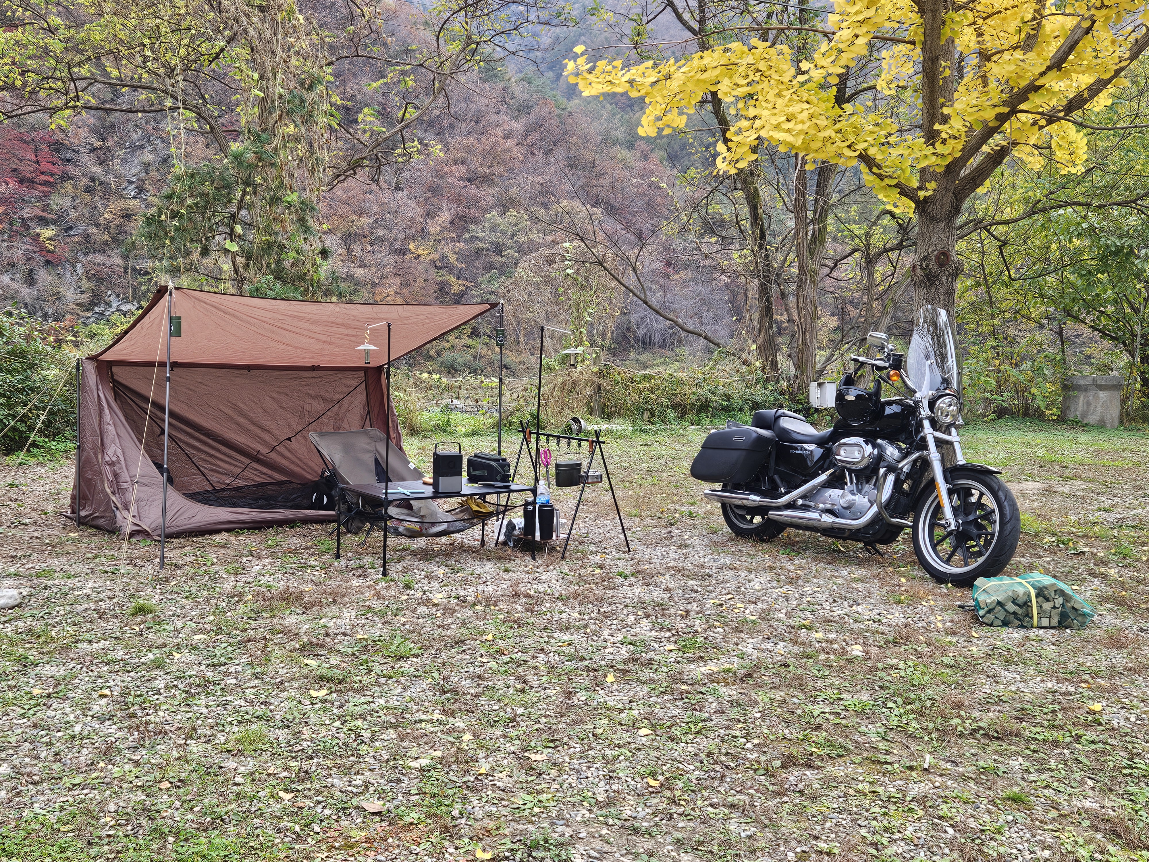 노오란 은행나무 아래 자리를 잡고 가을의 운치와 함께 캠핑을 즐겼다. 혼자서 바이크로 하는건 처음인데 역시 짐을 많이 실을 수 없는게 치명적.. 시시바를 탈거했더니 무거운 짐이 자꾸 뒤로 쏠려 조마조마 했다. (짐이 떨어져 사고날까봐)