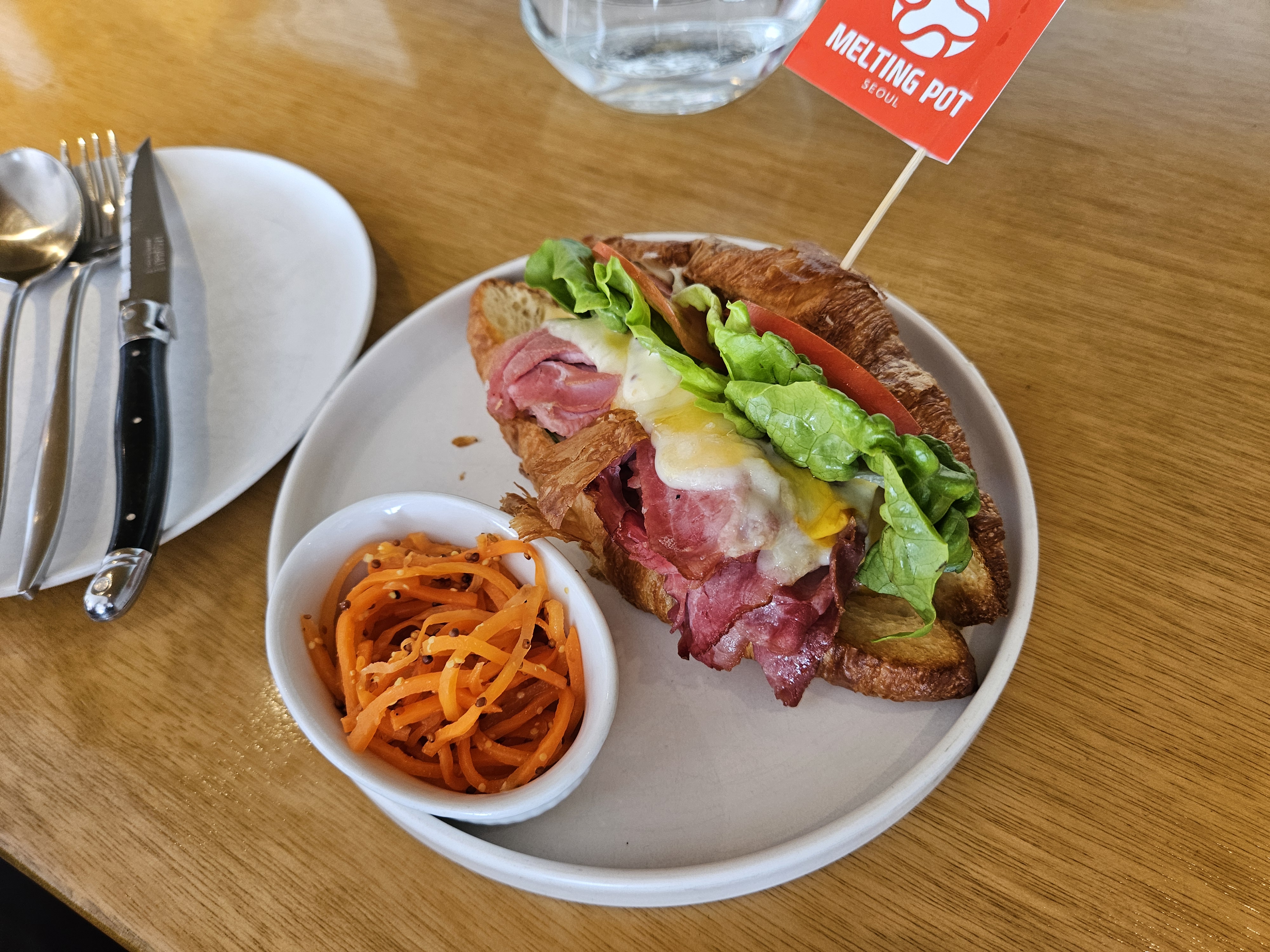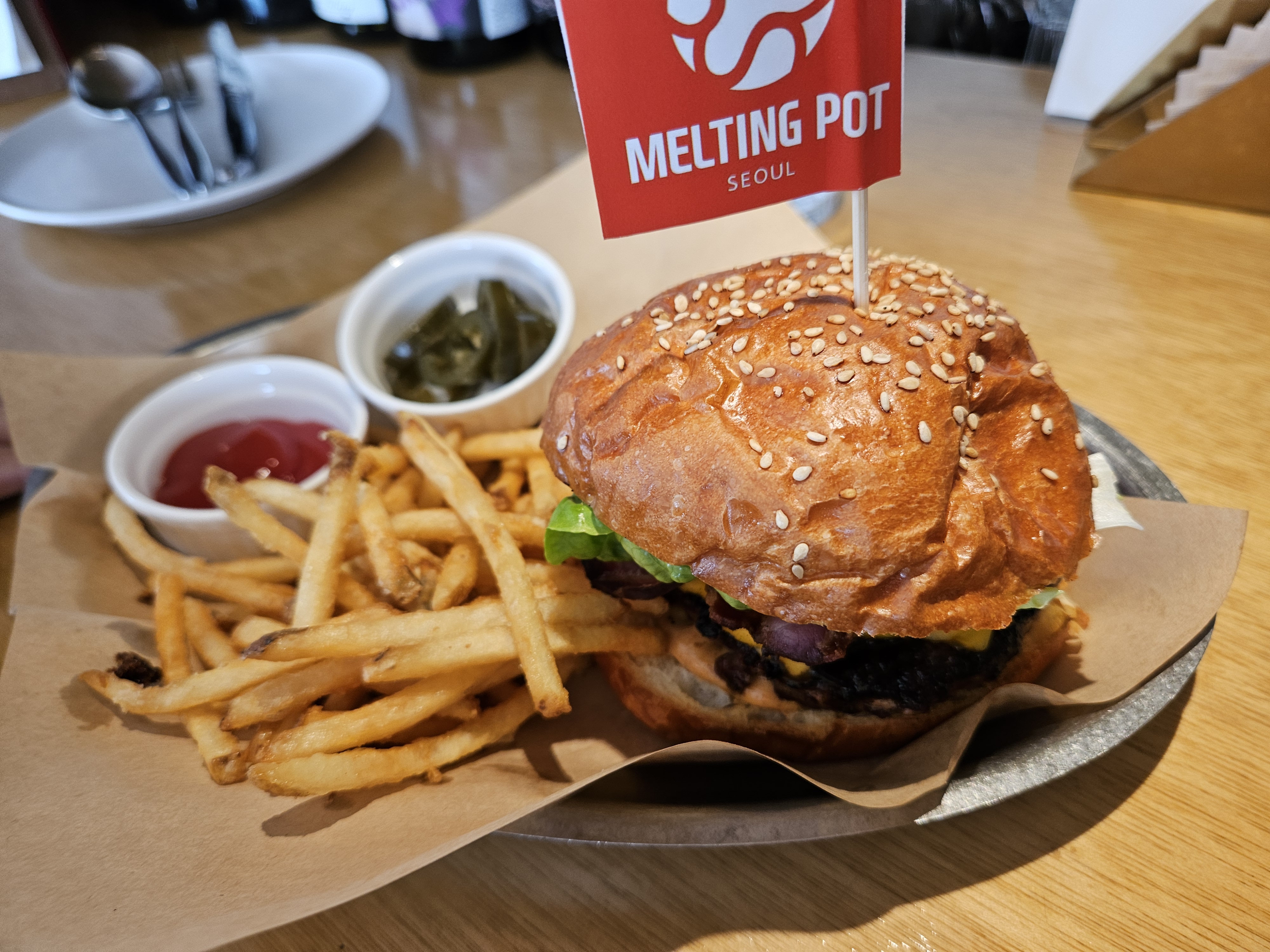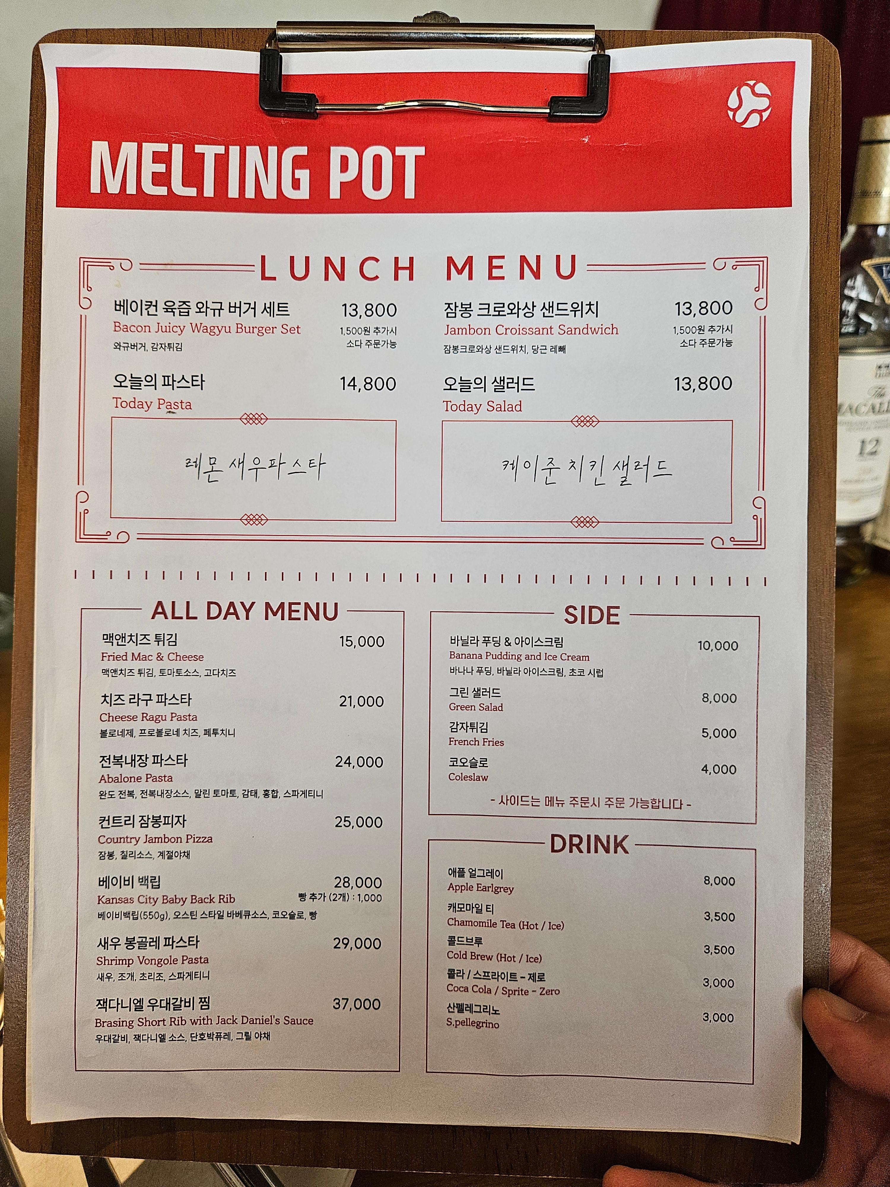 이런 좋은 의미를 담은 용산의 맛집 '멜팅팟' 을 소개한다. 가정집을 리모델링 해 만들어서 그런지 주방의 벽을 뜯어 낸 흔적이 그대로 있는 것이 인상적이다. 점심에 방문해서 런치메뉴를 먹었는데, 이 날은 버거/샌드위치/파스타를 시켜서 먹어 보았다.