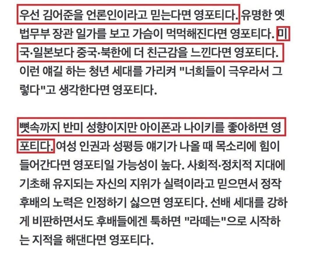 그러나 난 이 논란 자체가 4050과 2030을 갈라치려는 국정원 심리전단의 작품이라 강력히 추측한다. 왜냐하면 정치적 성향을 봤을 때, 4050이 가장 민주적이고 2030 남성이 가장 극우적이기 때문이다. 누군가 '영포티'를 정의한 위의 글을 보았을 때도, 김어준/조국/친북친중성향/반극우/성평등을 외치면 다 영포티라고 주장하고 있으며 이 공통분모를 봤을 때는 무조건 극우의 반대편이라는 것을 알 수 있다. 고로 '영포티 논란' 은 세대간에 갈등을 조장하고 갈라치기 하여 서로를 싸우게 만들고 혐오를 조장하여 정치적으로 반사 이익을 얻으려는 누군가의 의지가 투영된 것 같다.